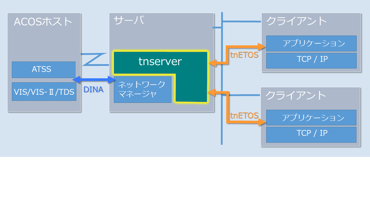 tnserverは、tnETOS端末を束ね、DINA手順に変換し、ACOSホストと通信するためのゲートウェイプログラムです。